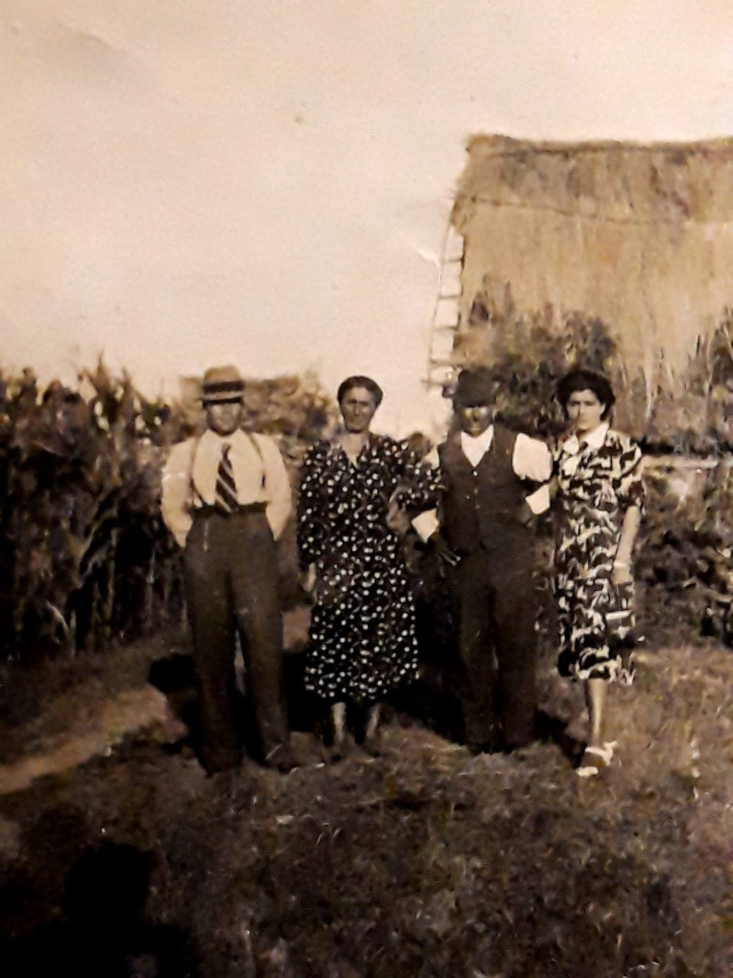 persone in posa alla frazione Catarana, si noti il casale in legno e paglia, anni '40 del Novecento